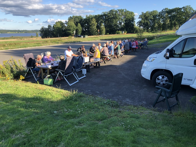 Gemensamt långbord runt 18-tiden. Var och en dukar upp sitt. Inomhus vid dåligt väder.