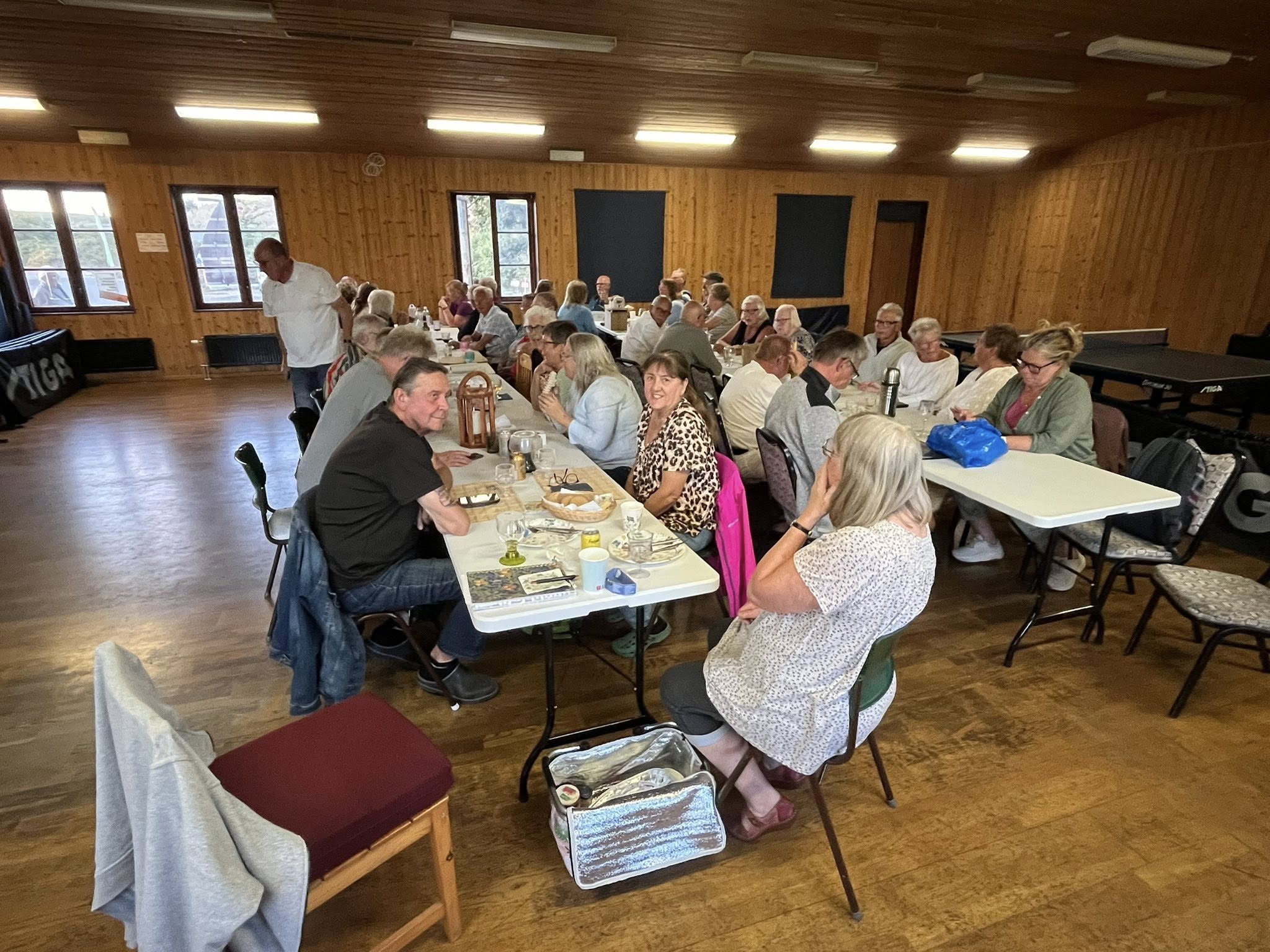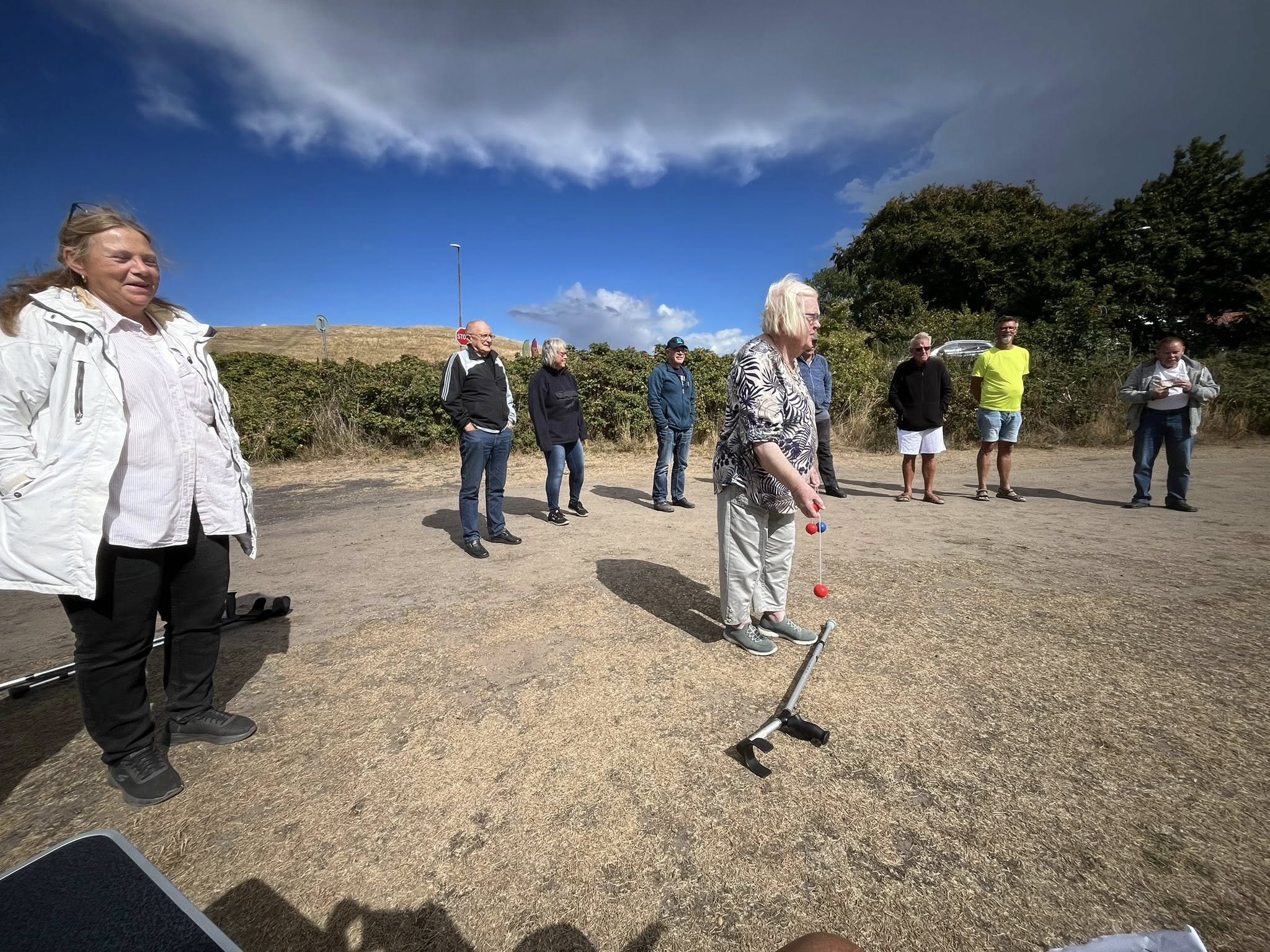 Många intog lunchen genomen att promenera genom vackra Kåseberga ner till hamnområdet där två bra restauranger väntade. Mätta, nöjda och belåtna återsamlades vi kl. 14.00 för de avslutande grenarna steggolf, poängkubb, cornhole och Yatzy.
