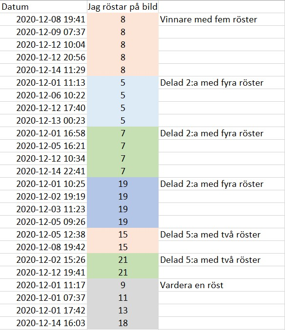 Hennes bild nr 8 på katten i handfatet fick fem av de 25 avlagda rösterna tätt följd av tre bilder med vardera fyra röster. Med andra ord väldigt jämt mellan fyra bilder.