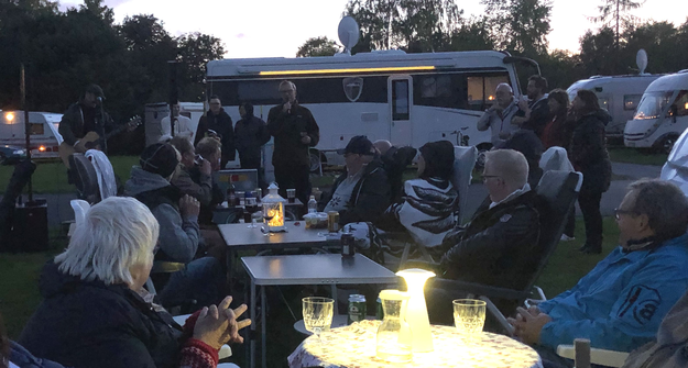På fredagen kom sista bilen och vi var fulltaliga. På kvällen var så dags för lite mat och dryck som AH bekostade. Som bruklig ett långbord av rang och till det kom Juno, trubaduren från Västerviksträffen tillbaka riggade upp sin anläggning och lirade tills inget såg mer; mörkret föll ganska snabbt över byn. Men som vanligt bra tryck i sång och musik.
