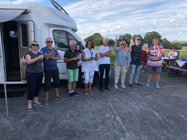 Fredagskvällen bjöd på strålande väder och vi samlades för långbords dukning och kvällens lottning av lagsammansättningen inför lördagens matcher.