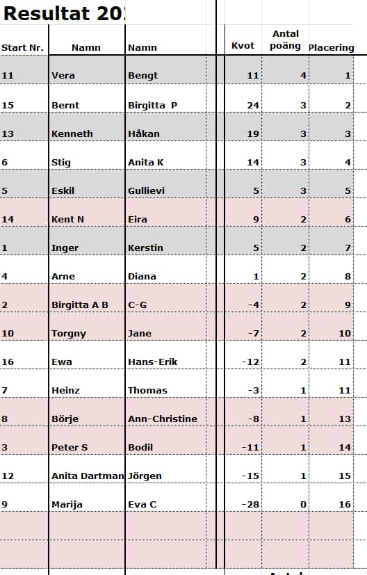 Lördagskvällen bjöd inte heller på något vackert väder, så vi dukade upp inomhus igen. Årets vinnare blev Vera Lind och Bengt Alström som vann alla sina fyra matcher. Tvåa Birgitta Persson och Bernt Bankemo tätt följda av Håkan Dartman och Kenneth Jarl.
