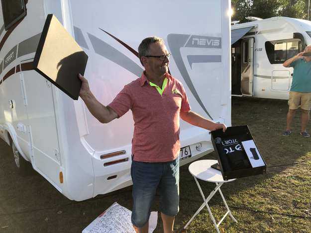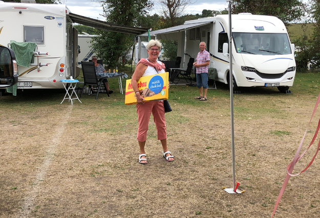 Fanns ett pris över och det skulle delas ut till den som kunde gissa hur många platspärlor det var i en burk. Bäst på den grenen var Christer Henriksson som fick en låda skänkt av Toyota i Halmstad. Då blir man så här glad.